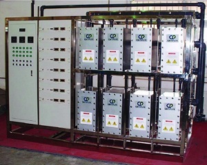 自来水中常含有钠、钙、镁、氯、硝酸盐、矽等溶解盐。这些盐是由负电离子(负离子)和正电离子(正离子)组成。反渗透可以除去其中超过99%的离子。自来水也含有微量金属,溶解的气体(如CO2)和其他必须在工业处理中去除的弱离子化的化合物(如矽和硼)。交换反应在模组的纯化学室进行,在那里阴离子交换树脂用它们的氢氧根据离子(OH-)来交换溶解盐中的阴离了(如氯离子C1)。相应地,阳离子交换树脂用它们的氢离子(H+)来交换溶解盐中的阳离子(如Na+)。